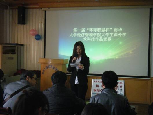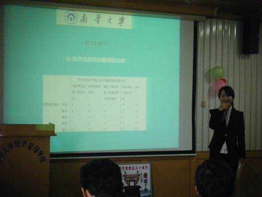 11月8日下午,我院第一届“环球雅思杯”大学生课外学术科技作品决赛在学院四楼学术报告厅举行。副院长刘萌芽、刘文君老师,营销系主任黎赔肆老师,工商系副主任刘保平老师担任决赛评委。