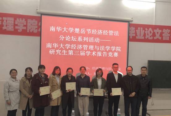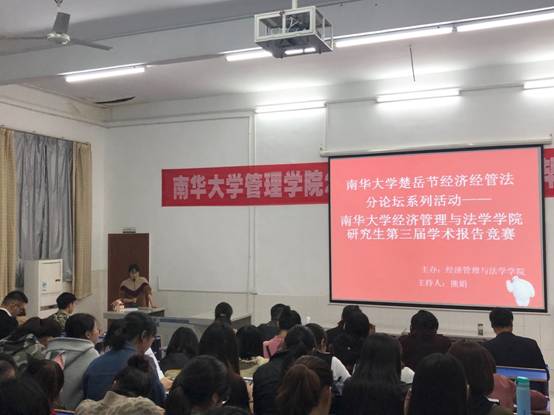 11月6日晚上19:00,南华大学第十二届研究生楚岳节yl23455永利官网分论坛——yl23455永利官网第三届研究生学术报告竞赛在MBA三楼大教室成功举行,此次学术竞赛由我院研究生分会协助,熊娟老师主持,同时邀请了谢荷峰、刘保平、傅华丽、易永锡、张俭等五位研究生导师担任本次大赛的评委,100余名研究生观看了比赛。
