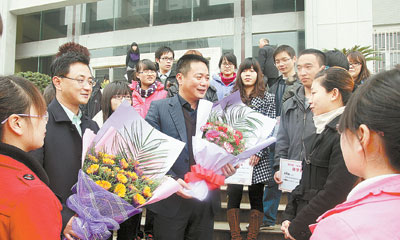 会后,邱醒亚先生(中捧鲜花者)与我院学生交流